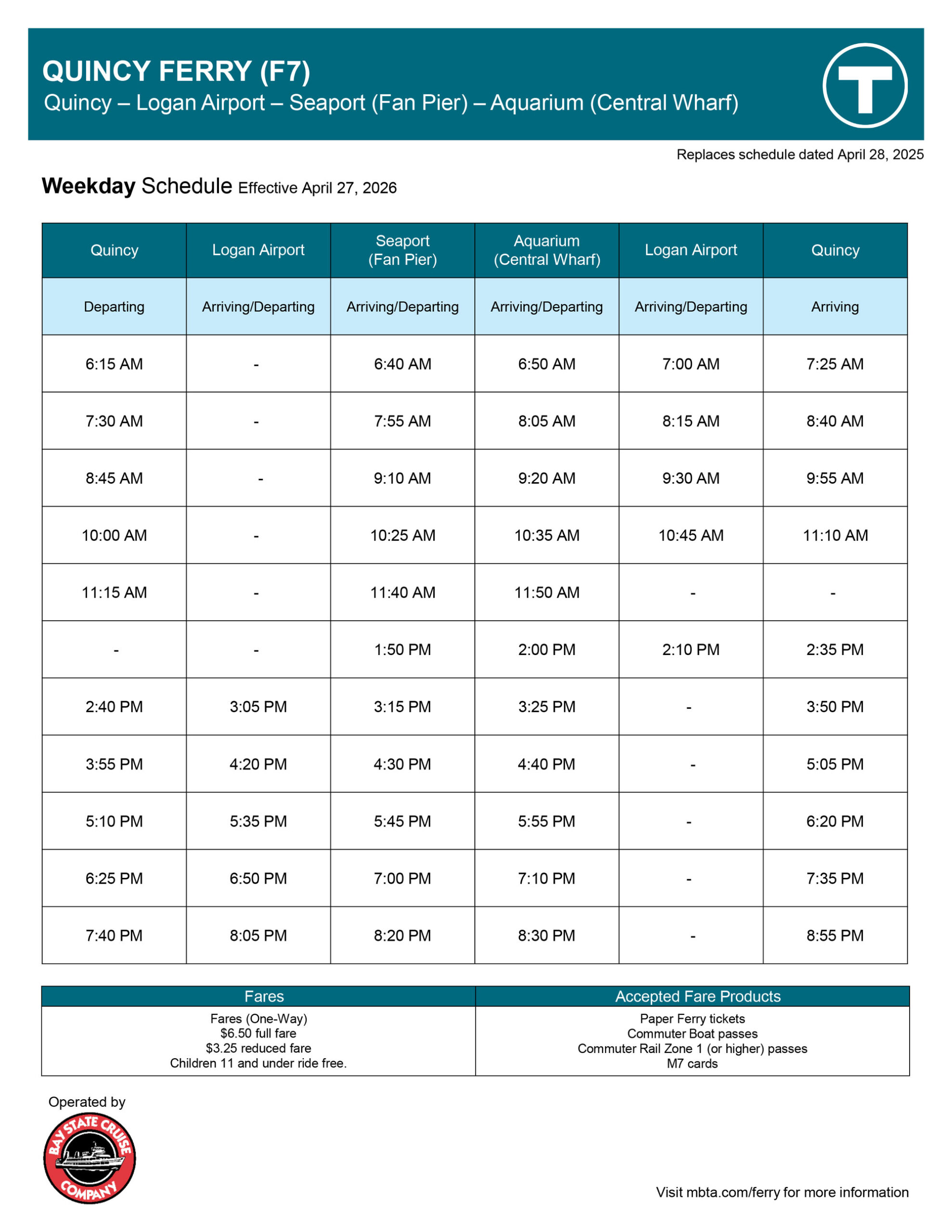 2026 ScheduleF7 Quincy weekday:Seasonal start date for weekday is 04/07/26.F8 Winthrop & Quincy weekend:Seasonal start date for weekend service is 05/26/26.Weekday Schedule Download PDFWeekend ScheduleWeekend Schedule Coming Soon! GET TICKETS